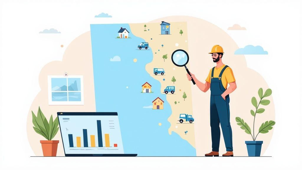 The best place to start is a simple, targeted Google search. Use the exact phrases a potential client would type in, like “roofing contractor in Salinas” or “emergency HVAC repair Santa Cruz.” The businesses that pop up consistently in the top search results and the local map pack are your key digital rivals. They are winning the online visibility game, and you can learn a ton by doing a deep dive into local SEO for contractors in Salinas.