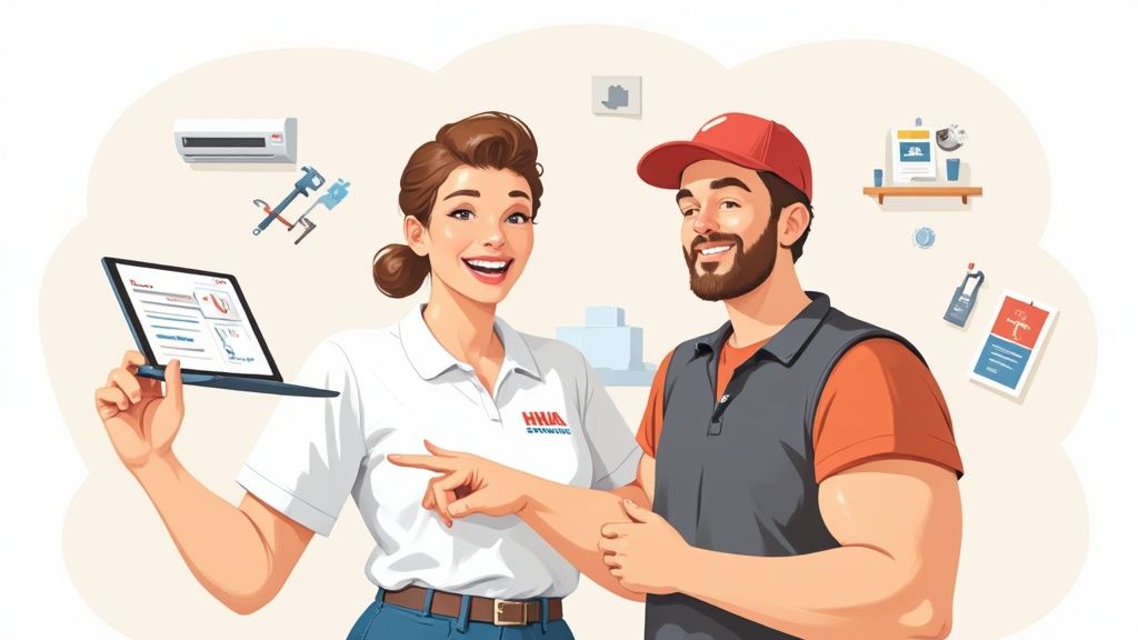 To really build this local authority, create dedicated "service area" pages on your site. Don't just list the towns you work in. Make a unique page for each major city or neighborhood. On that page, talk about common HVAC problems specific to that area, mention a local landmark, and drop in a testimonial from a customer who lives there. This proves your deep connection to the community and sends strong signals to Google that you are a relevant local provider. For more ideas, you can explore our guide on 5 local SEO hacks for contractors that offers more hands-on tips. This focused, hyper-local approach is what separates the top-ranking contractors from everyone else.