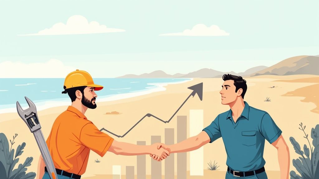 This isn’t a cheap template. We build you a custom website designed for one purpose: to turn visitors into paying customers. It’s fast, mobile-friendly, and built from the ground up to rank on Google. This approach ensures your digital foundation is strong, setting you up for long-term success without the large initial investment. For a deeper dive into our contractor marketing approach, see the best marketing strategies for contractors on our blog.
